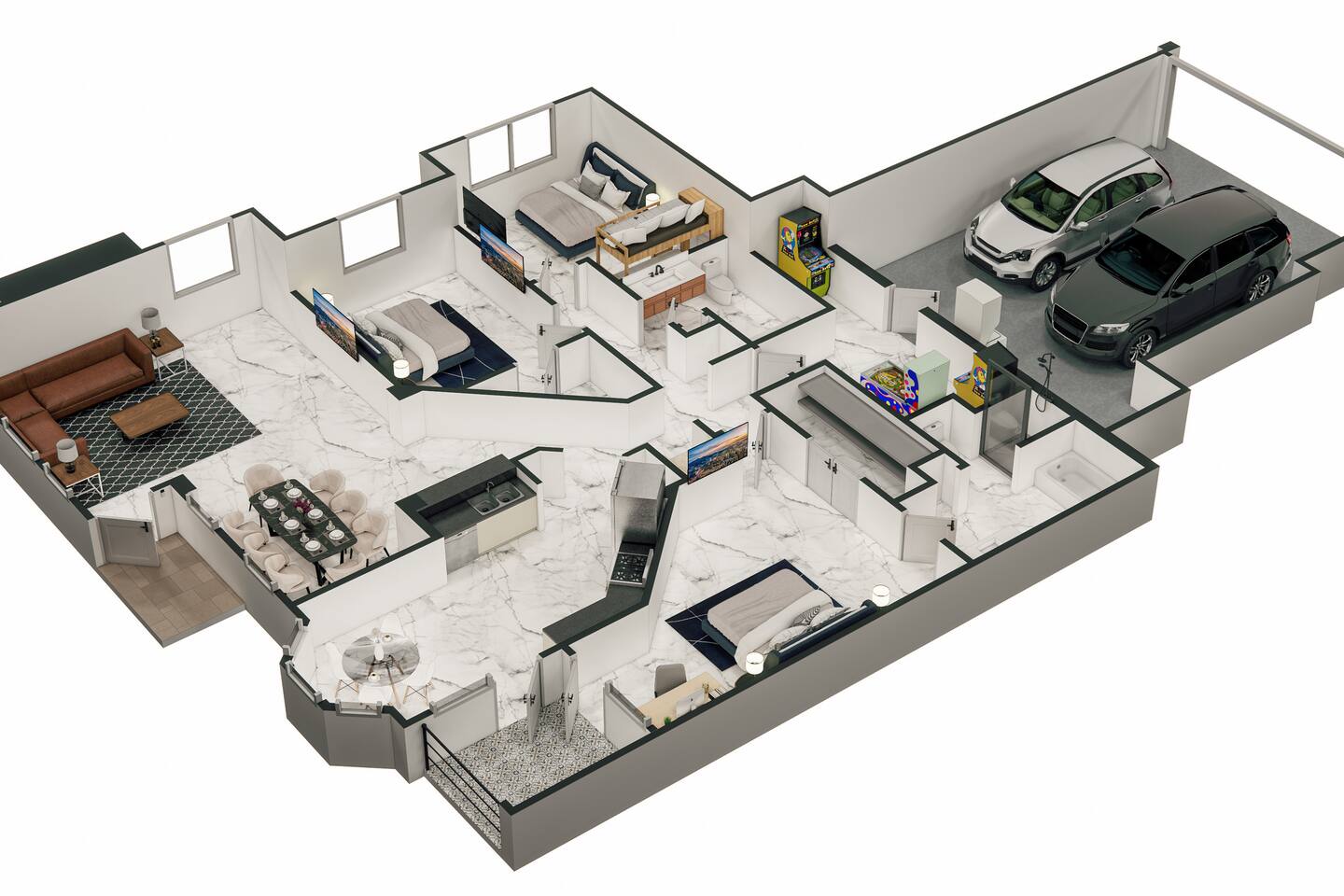 This beautifully updated 3-bedroom, 2-bathroom condo has everything you need for a relaxing and memorable stay—perfect for families, friend groups, or business travelers. ★ Spacious & Modern A fully equipped kitchen and large living area provide all the comforts of home. ★ Full-Size Garage Secure, private parking for your convenience. ★ Two Pools Enjoy access to two sparkling pools—great for soaking up the sun or cooling off after a day out. ★ Arcade Area Fun for all ages with games to keep kids and adults entertained. ★ Professionally Cleaned Our dedicated cleaning team ensures the condo is spotless and guest-ready for every stay. Sleeping Arrangements: ★ Master Bedroom: King bed, en-suite bathroom, and ample closet space. ★ Second Bedroom: Queen bed with cozy furnishings. ★ Third Bedroom: Two twin beds—ideal for kids or extra guests. Bathrooms: ★ Primary Bathroom: Features a walk-in shower and double vanity. ★ Second Bathroom: Includes a shower/tub combo, convenient to the other bedrooms. Prime Location: ★ Close to Everything: Just minutes from top restaurants, shopping, casinos, and family attractions in both Gulfport and Biloxi. ★ Beach Nearby: Easy access to beautiful Gulf Coast beaches—walk or take a short drive. ★ Simple Travel: Quick access to highways and local transportation options. Extras You'll Love: ★ High-speed WiFi ★ Smart TVs in the living room and master bedroom ★ In-unit washer and dryer ★ Central air and heating ★ Beach gear (towels, chairs, umbrellas) Enjoy the best of the Gulf Coast in a clean, comfortable, and well-equipped home base. Book now and let the memories begin!